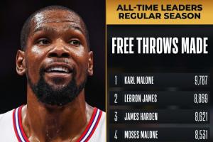 截至发稿时,火箭球星杜兰特罚球4中4,生涯常规赛罚球命中数来到7695个,超越“大O”奥斯卡·罗伯特森(7694个)升至历史第六,前面一位是科比(8378个)。